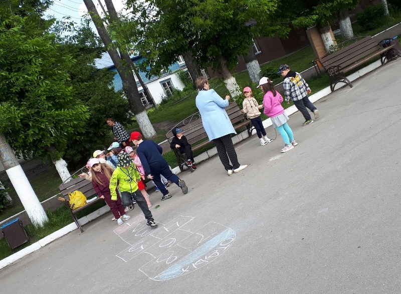 На центральной площади поселка было организовано уличное мероприятие, перекликающееся тематикой с областным фестивалем детских игр во дворе "Классики". Оказалось такие простые развлечения, как игра в классики и прыжки через скакалку чрезвычайно привлекательны и для современных мальчишек и девчонок.