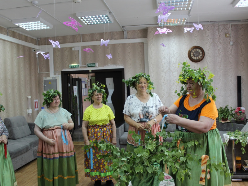 В отделении дневного пребывания прошло мероприятие «Троица, троица, земля травой покроется», отдыхающие познакомились с историей и обычаями празднования Троицы, сплели венки из березы, украсили березу шелковыми лентами и загадывали желания. В этот день вспомнили еще одну традицию: молодые девушки и женщины «кумились» через березовый венок, целовались и становились подругами на всю жизнь, под музыку и народные песни водили хоровод, славили березку.